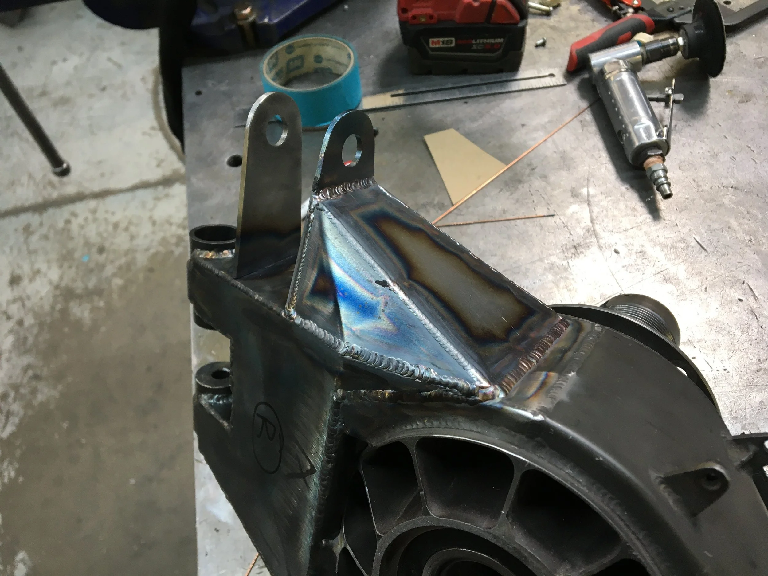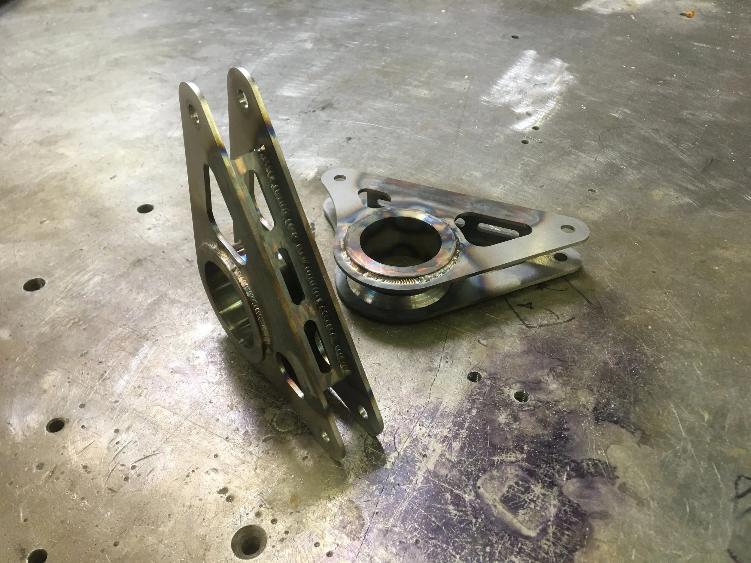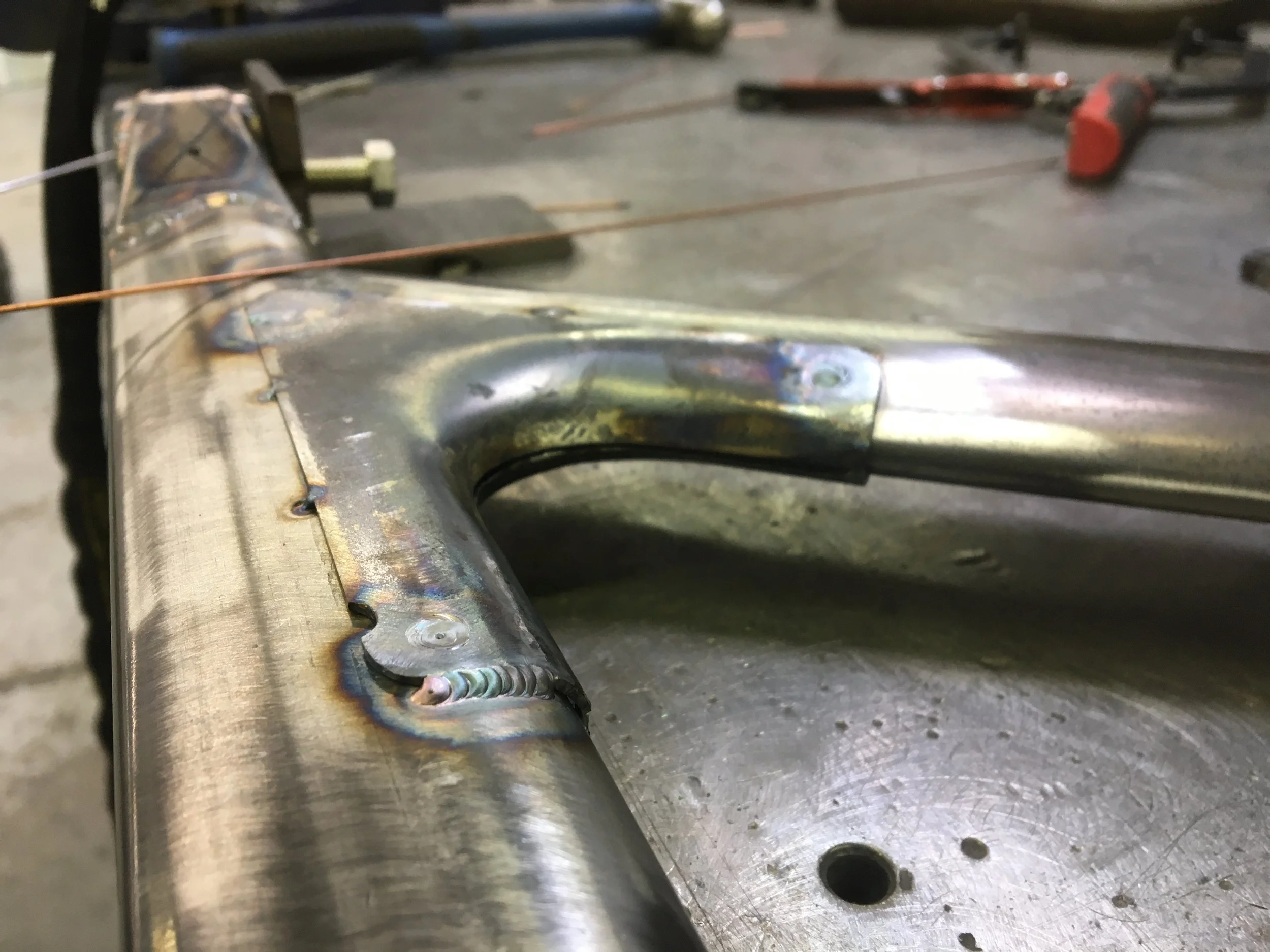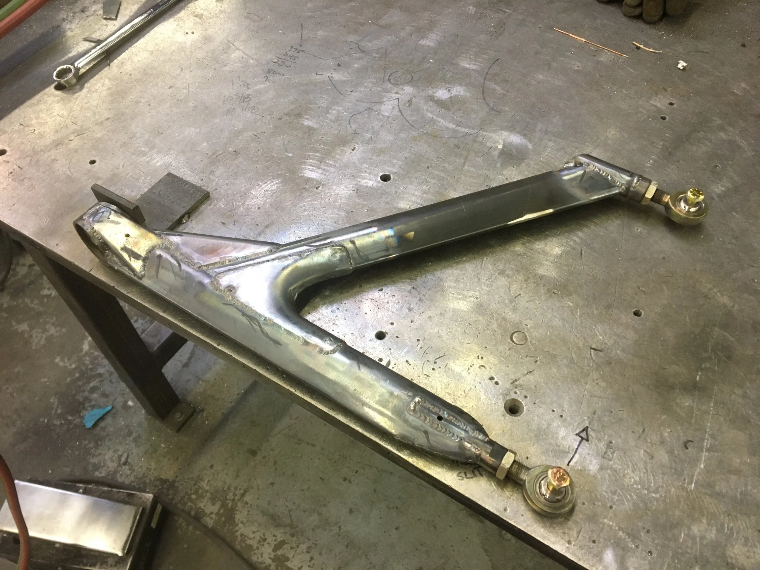 Being constrained by the existing suspension attachment points while moving the front axle back leads to some fun problem solving with the control arms. 4130 aero tubing is utilized for improved rigidity in critical directions, and formed gussets were made reinforce critical areas.