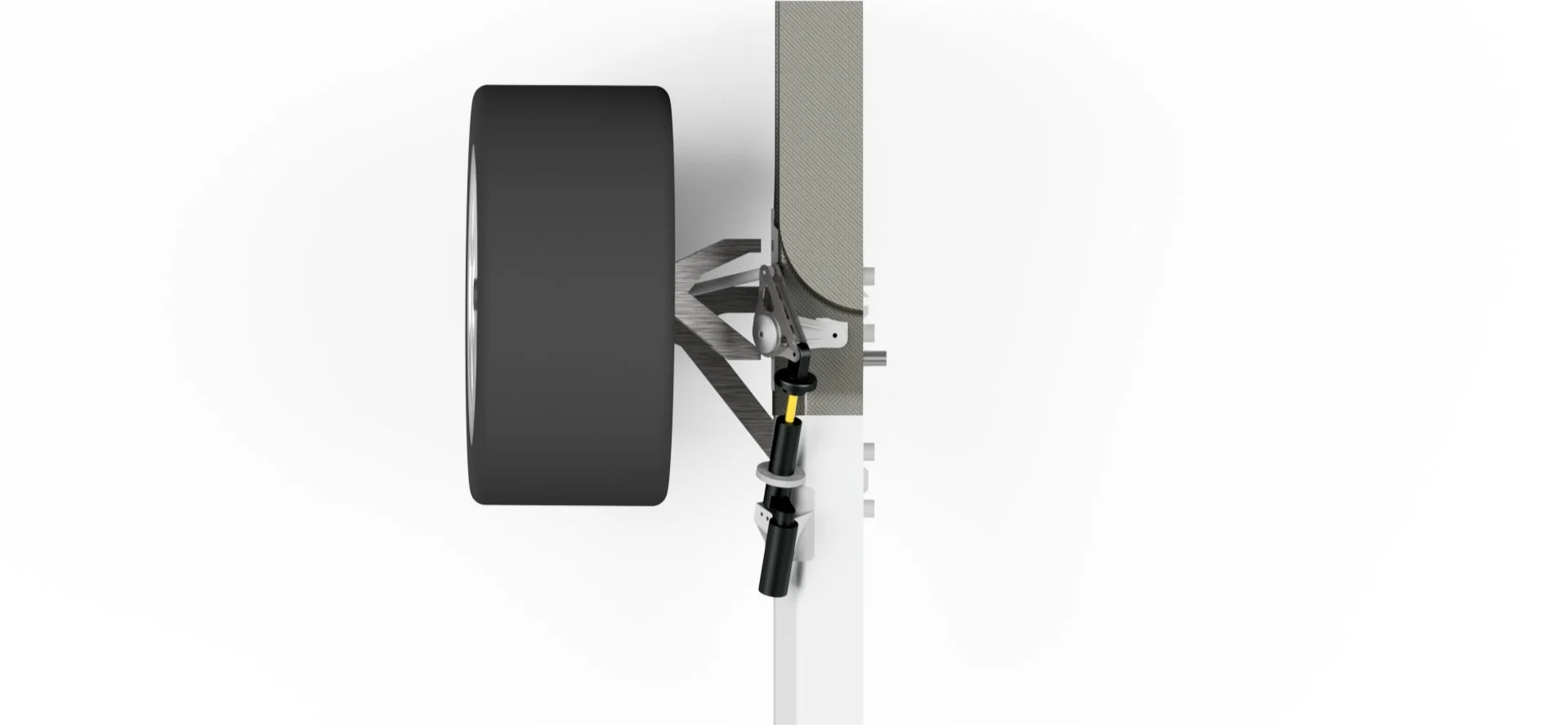 The rocker links are laser cut 4130 and utilize a precision turned center bearing carrier. Geometry is chosen to achieve the desired amount of progressive wheel rate in compression. Pushrod and shock alignment are refined to minimize thrust/axial loads as much as possible, but IGUS bushings are utilized to deal with those loads. Bushings offer lighter weight, more compact solution than bearings in this application.