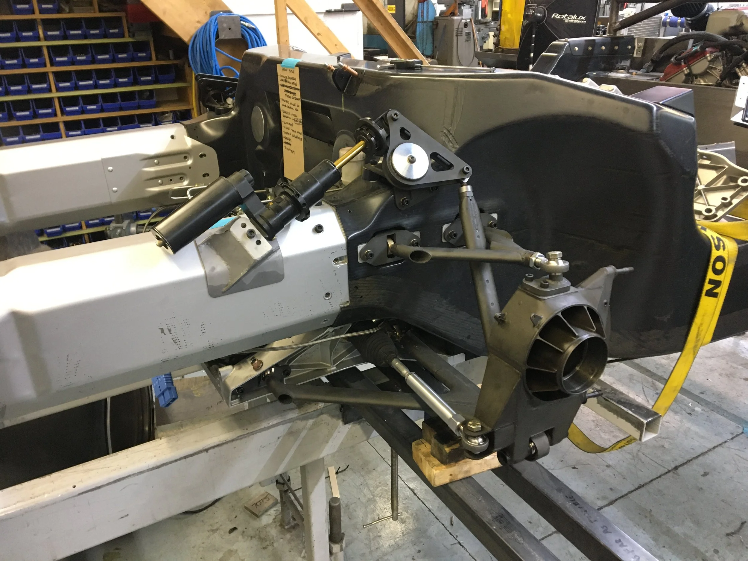 The Ferrari V12 is just a bit longer and heavier than the Nissan-based V8 these rolled out of the showroom with, hence the extensive cutting of the tub. Some wheelbase adjustments were made to keep the weight distribution reasonable as well. When you have a carbon tub with fixed suspension attachment points, axles in different locations than intended, lower ride height, and radically wider tires, how do you go about packaging the front suspension and keeping the geometry in check?