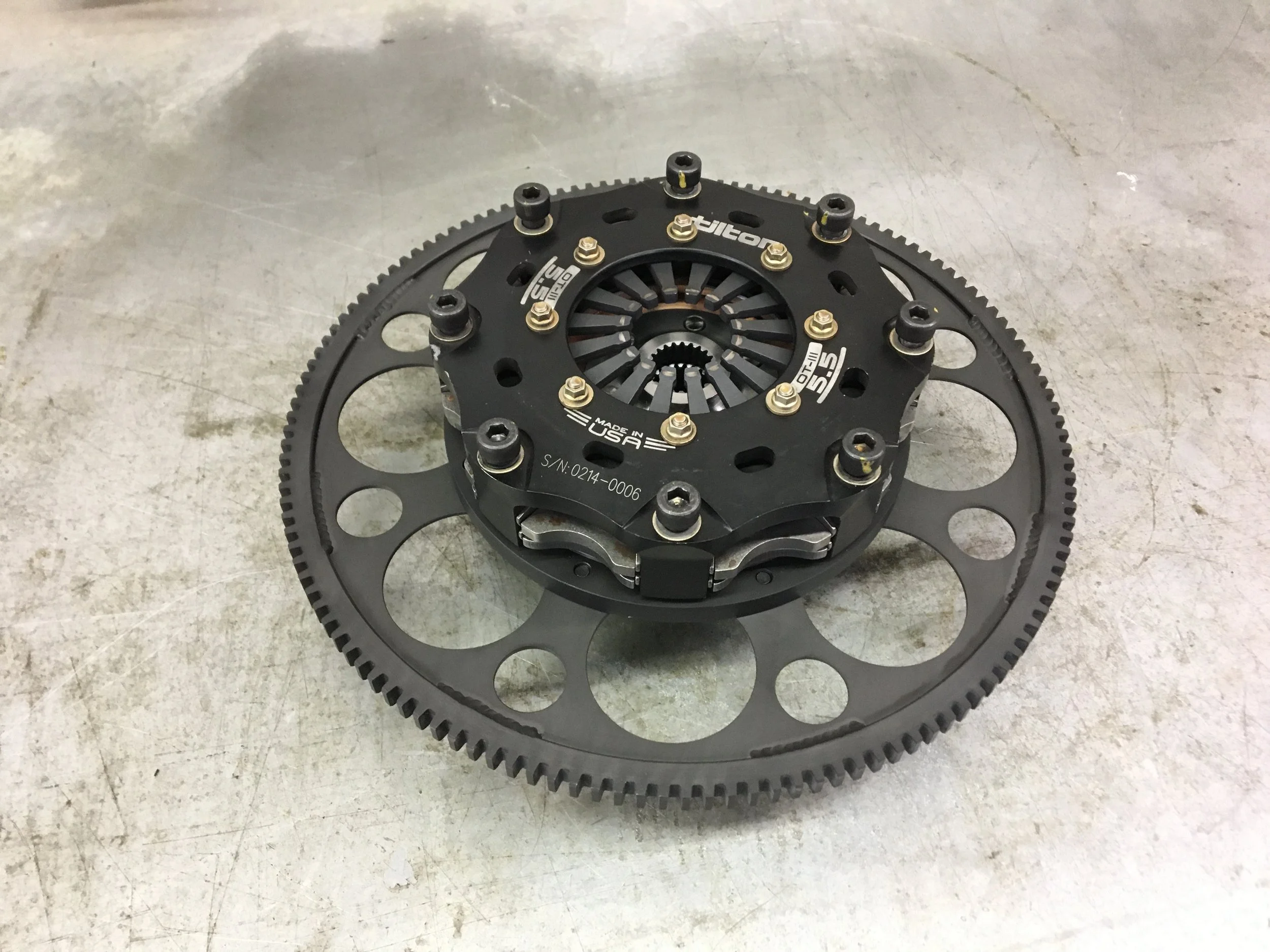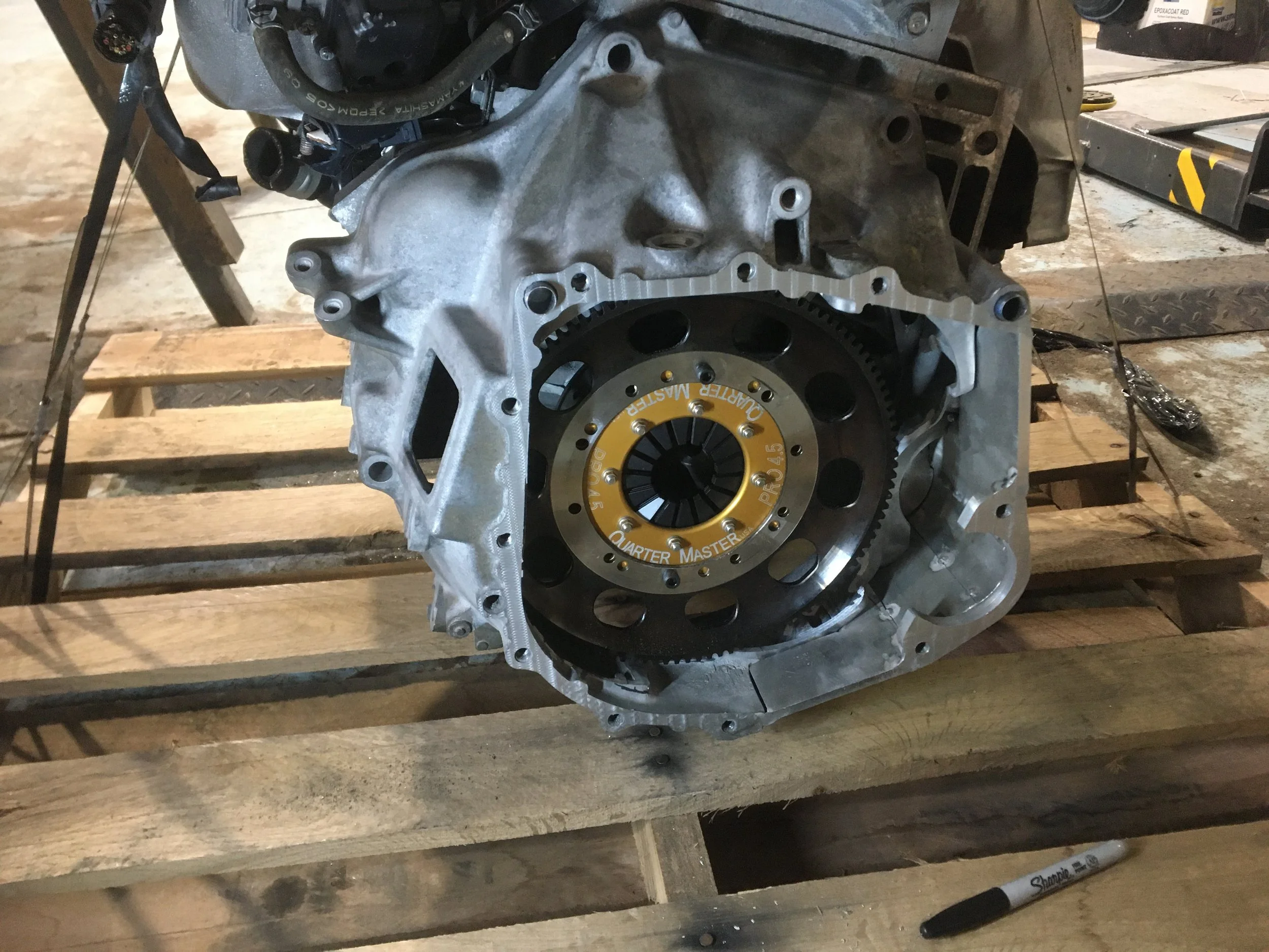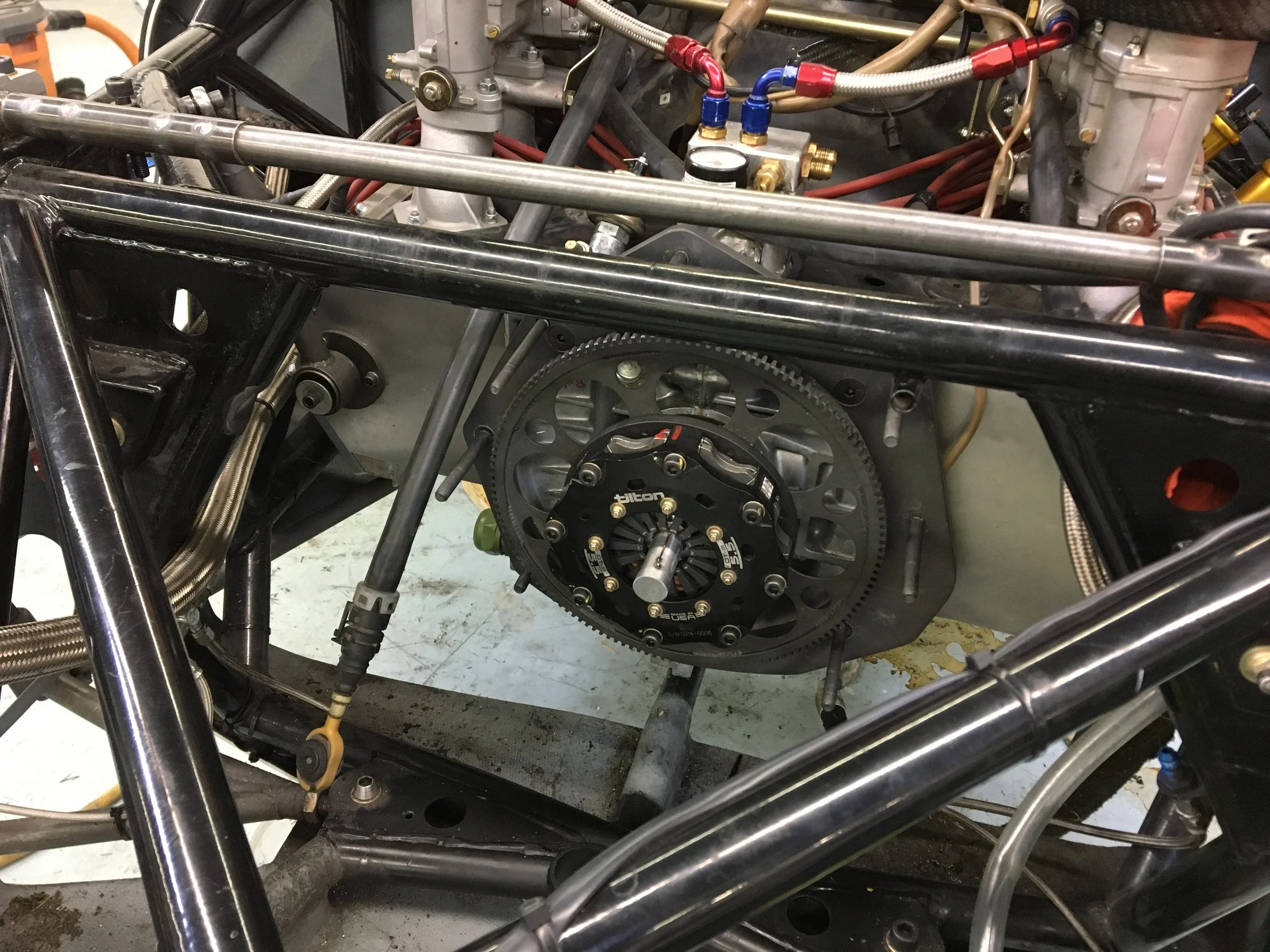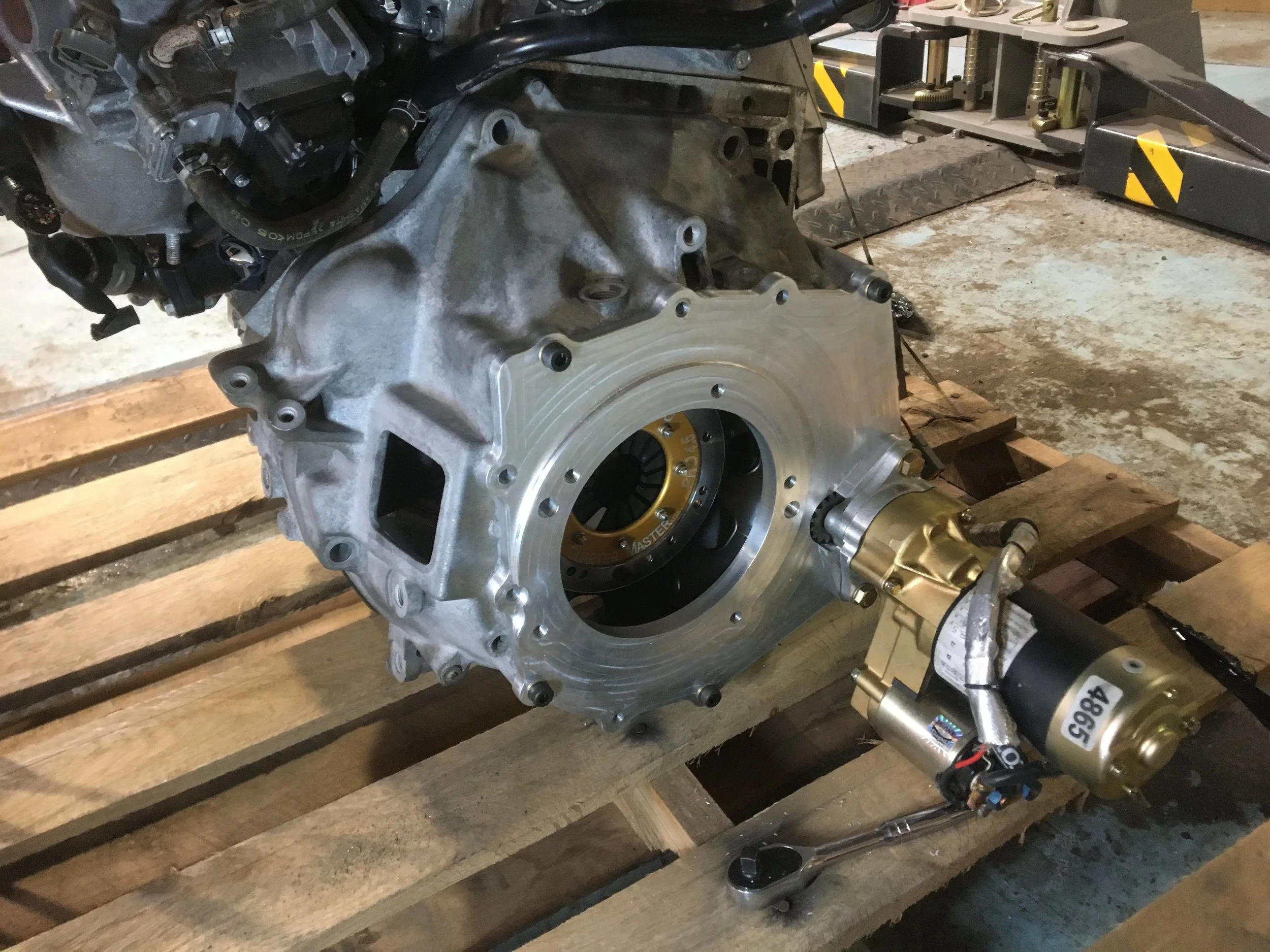 A 4.5” clutch keeps rotational inertia to a minimum, a repurposed NASCAR starter gets things going, and CNC machined adapters ensure the Honda bellhousing and Corvette torque tube play nicely with the transaxle.